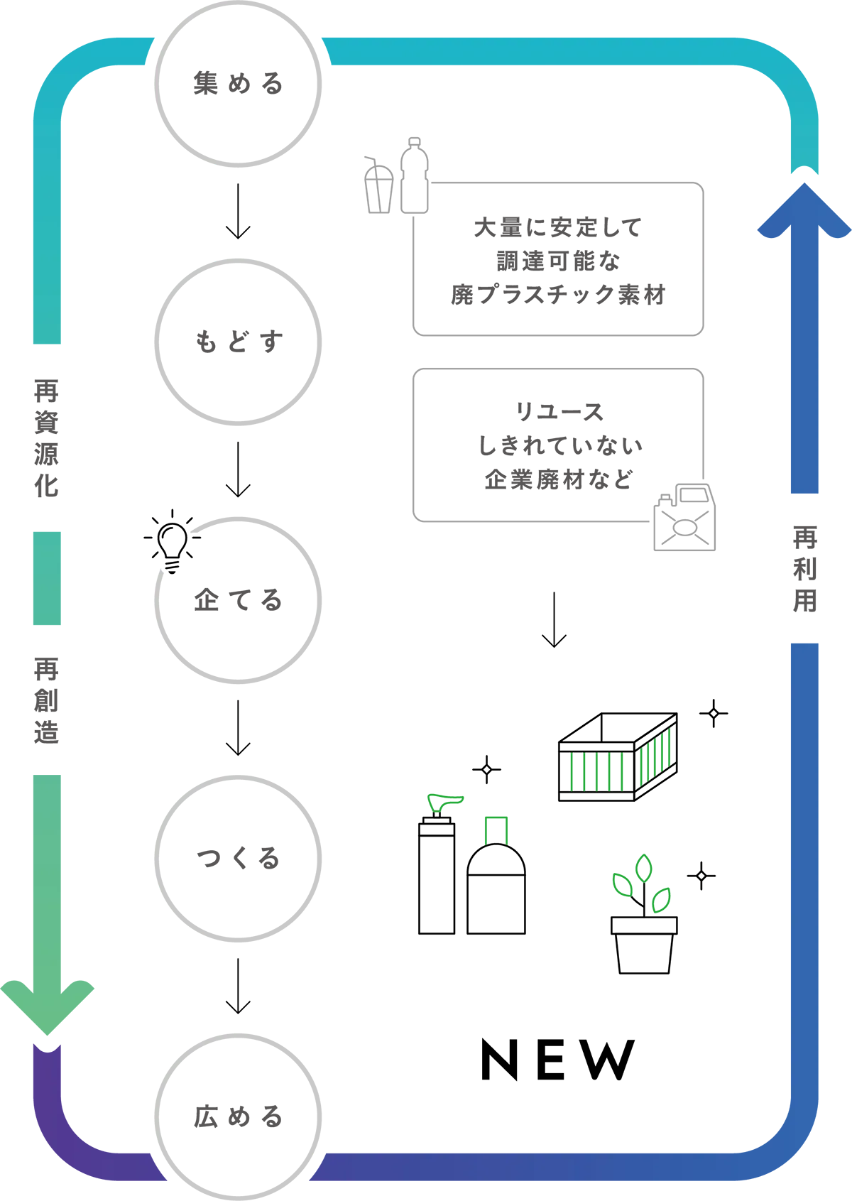 小野由の再資源化事業HORANDEは、安定して調達可能な廃プラスチック素材に加えて、リサイクル”されていない”、あるいはリサイクル”されにくい”廃プラスチック素材を活かしたモノづくりに取り組んでいます。また、世の中で再利用されるにはどんな製品をつくるべきか、出口から逆算して、製品を企画してつくる「再創造」工程、資源廃棄物を集めて資源にもどす「再資源化」の工程を一貫できることが、小野由の再資源化事業 HORANDEの特長です。