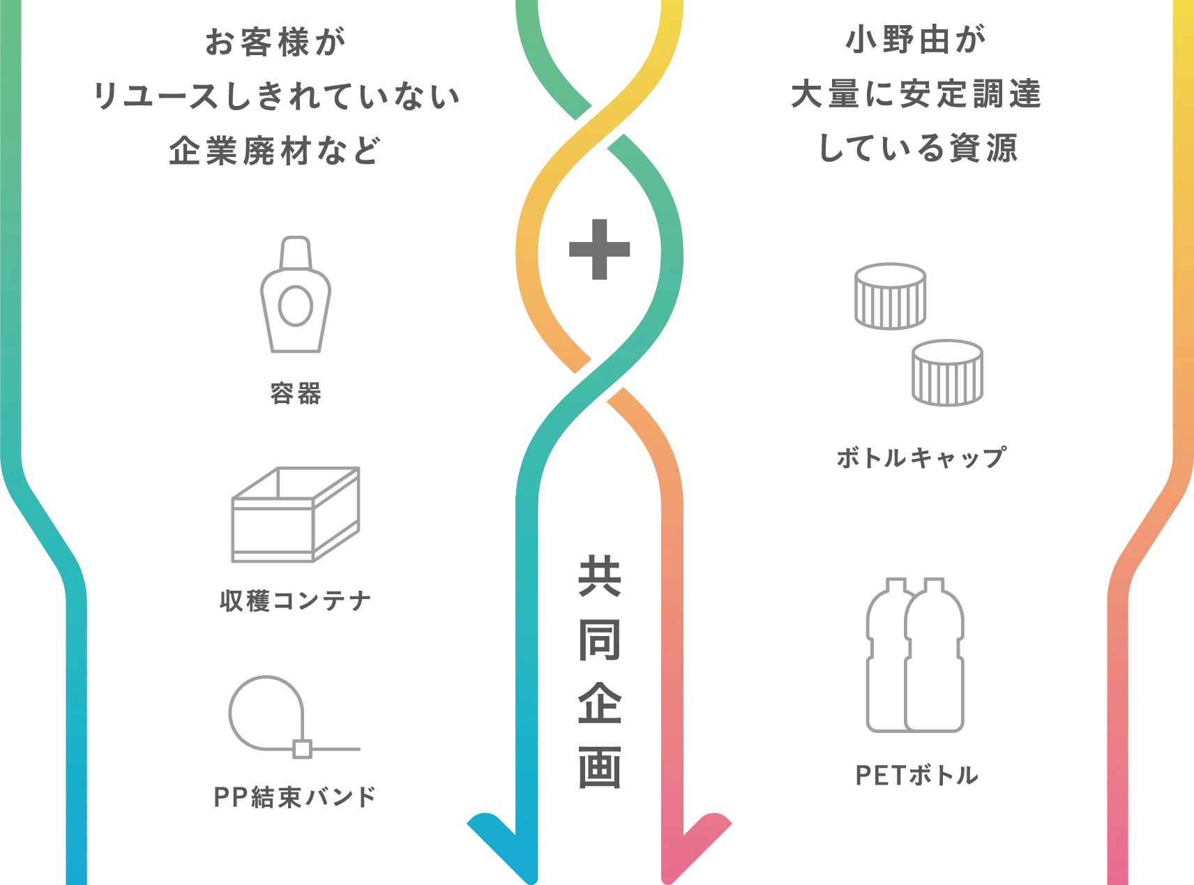 プラスチックを再資源化し、そして、新しいサステナブル製品へと再創造すること。創業140年を超える小野由は、樹脂原料の卸売りや加工プラスチック製品の製造等の事業に加え、プラスチック資源に関する“再資源化(アップサイクル)事業“を新たに推進していきます。