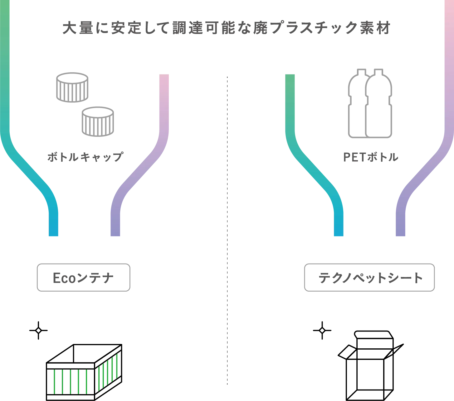 “HORANDEプロダクト”は、再資源化された原料をもとにした、コスト優位性のある小野由のオリジナルECO製品です。 例えば、ボトルキャップからつくりだした「ECOンテナ」や、PETボトルから再資源化した「テクノペットシート(TPS)」等、様々な製品があります。コスト抑制と環境配慮を両立した製品をお求めの方に向けて、小野由はこれからもECOなプラスチック製品を開発していきます。